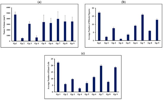 Average tumor volume (a), average number of mitotic figures (b), and average number of giant tumor cells (c) on day 14 post-treatment. Gp2, Gp3, Gp4, and Gp5 are the animal groups assigned for oral administration of TAM bilosomes, TAM suspension, TAM/PRO bilosomes, and TAM/PRO suspension, respectively. Gp6, Gp7, Gp8, and Gp9 are the animal groups assigned for intratumor administration of TAM bilosomes, TAM suspension, TAM/PRO bilosomes, and TAM/PRO suspension, respectively. Gp1 presents the untreated animal group.