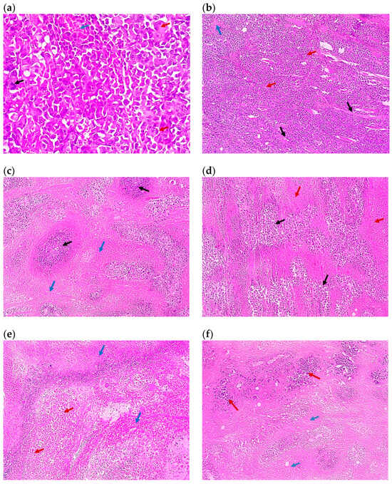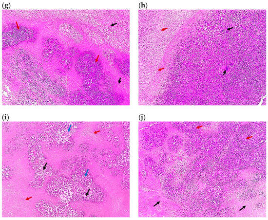 Representative photomicrographs of the tumor sections of (a) Group 1, the control (×100), showing solid sheets of malignant cells (red arrows) infiltrating muscle fibers (black arrows) with a focal area of necrosis (blue arrow), (b) the control at higher magnification (×400), showing malignant cells exhibiting pleomorphism, hyperchromatisa, and abnormal mitotic figures (black arrow) and tumor giant cells (red arrows) with a focal area of necrosis (blue arrow), (c) Group 2 (×100) showing malignant cells (black arrows) surrounded by 80% of tumor necrosis (blue arrows), (d) Group 3 (×100), showing malignant cells (black arrows) surrounded by 50% of tumor necrosis (red arrows), (e) Group 4 (×100), showing shadows of necrotizing malignant cells (red arrows) surrounded by 95% of tumor necrosis (blue arrows), (f) Group 5 (×100), showing malignant cells (red arrows) surrounded by 70% of tumor necrosis (blue arrows), (g) Group 6 (×100), showing malignant cells (red arrows) surrounded by 50% of tumor necrosis (black arrows), (h) Group 7 (×100), showing malignant cells (black arrows) surrounded by 20% of tumor necrosis (red arrows), (i) Group 8 (×100), showing malignant cells (blue arrows) with tumor vacuolar changes (black arrows) surrounded by 60% of tumor necrosis (red arrows), and (j) Group 9 (×100), showing malignant cells (red arrows) surrounded by 30% of tumor necrosis (black arrows). All images are captured at magnification power ×100, except (b) which is at ×400. Details regarding the different groups are presented in Table 2.