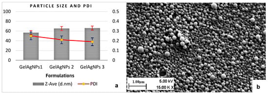 (a) DLS studies showing particle size and PDI value at 28 °C. (b) SEM image of 1% gelatin AgNPs.