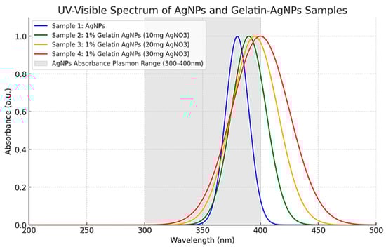 UV-Visible absorption spectra of AgNPs and gelatin-stabilized AgNPs at different AgNO₃ levels. Sample 1 (blue): commercial AgNPs, Sample 2 (green): gelatin-stabilized AgNPs (1% gelatin, 10 mg AgNO₃),Sample 3 (orange): gelatin-stabilized AgNPs (1% gelatin, 20 mg AgNO₃), Sample 4 (red): gelatin-stabilized AgNPs (1% gelatin, 30 mg AgNO₃). The shaded region reveals AgNPs’ 300–400 nm plasmon resonance. Due to particle size or aggregation, higher silver nitrate concentrations redshift the plasmon peak.