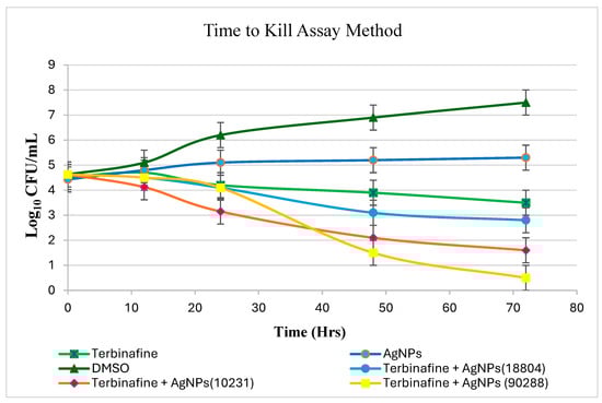 Time–kill assay experiments were conducted by inoculating the C. albicans strains ATCC 10231, ATCC 18804, and ATCC 90028 into potato dextrose agar (PDA) medium at a final concentration of 4.5 × 10⁴ cells/mL. PDA medium was chosen because it supports fungal growth over extended periods, which is essential for monitoring time–kill dynamics. A 5 mL aliquot of each culture was dispensed into tubes containing Terbinafine, DMSO (as a negative control), AgNPs, and a combination of Terbinafine and AgNPs. After adding varying concentrations of the drugs or combinations, the tubes were incubated at 30 °C with shaking at 220 rpm. At set intervals (0, 12, 24, 48, and 72 h), 100 µL samples were diluted in 1× PBS and streaked onto SDA plates. Yeast colonies were counted after 2–3 days of incubation at 30 °C, and the results were plotted as the mean colony count (log10 CFU/mL) [].