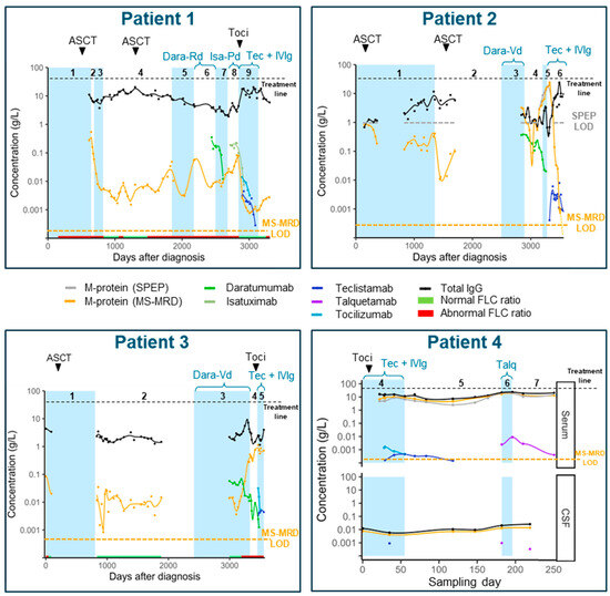 Recently, we have expanded our MS-MRD assay into a multiplex blood test that allows the ultra-sensitive monitoring of the M-protein, different t-Abs, and all the polyclonal immunoglobulin (Ig) classes in one MS measurement. This study demonstrates a proof-of-concept of the MS-MRD multiplex assay in longitudinally collected sera over a follow-up period of up to eleven years during which the patients have received different t-Abs. The combined dynamic monitoring of MRD activity, therapeutics, and polyclonal Igs using MS-MRD provides unique insights into therapy response kinetics in patients with MM.