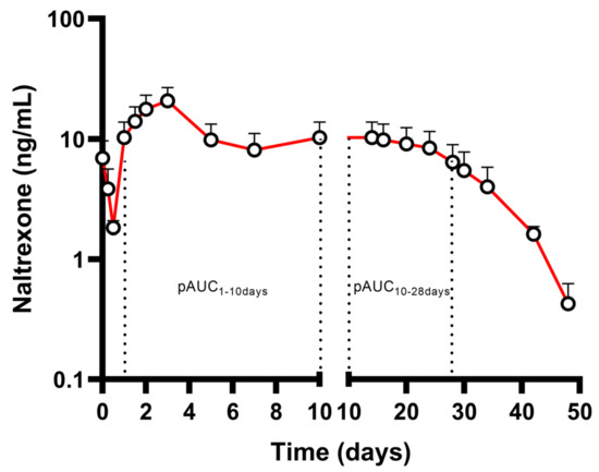 Pharmacokinetic profile (mean drug concentrations in the logarithmic scale + SD) after a single application of long-acting naltrexone 380 mg (Vivitrol®) in healthy volunteers (n = 10). The X-axis is segmented to highlight the behavior of the formulation between Days 1–10. PAUC1–10days and pAUC10–28days are highlighted (adapted from [34]).