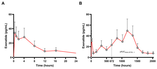 Exenatide is a synthetic form of a naturally occurring GLP-1 receptor agonist, administered once-weekly SC as a long-acting injectable (Bydureon®, AstraZeneca Pharmaceuticals LP/AstraZeneca AB) for the treatment of type 2 diabetes mellitus [61]. Upon administration of a single dose of the exenatide LAI product, exenatide is gradually released from the microspheres over a period of approximately 10 weeks [62]. Initially, there is a release of surface-bound exenatide (burst effect of 1–2% of exposure), followed by a slow release from the microsphere formulation, resulting in two peaks in plasma exenatide levels: within week 2 and between weeks 6 and 7. The single-dose PK profile of a 2.5 mg subcutaneous dose of long-acting exenatide injectable (Bydureon®) up to 12 weeks can be seen in Figure 5 (adapted from [63]). Figure 5A depicts the PK profile of the first 24 h post dose, while the whole PK profile is shown in Figure 5B.