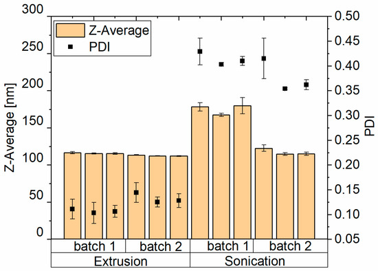Impact of the manufacturing process on Z-Average and Polydispersity index (PDI) between T14diLys:DOPE (1:2) liposome (0.05 µg/µL) preparation with extrusion and sonication in 10 mM MES buffer pH 6.5, three samples per batch with three measurements each.