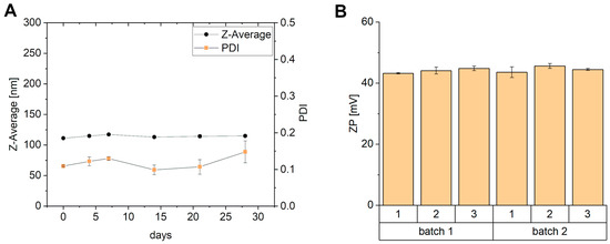 To obtain information about the stability of the liposomes during a longer period, the liposomes were stored at 4 °C for 28 days, and the size and PDI were measured on days 0, 4, 7, 14, 21, and 28 (Figure 2A). No major changes in size and PDI can be observed. In terms of liposome stability, the zeta potential needs to be considered as well. The zeta potential of the liposomes is above 30 mV and does not change from batch to batch (Figure 2B). The high stability of the dispersion can be explained by the repulsive forces of the particles [28,29].
