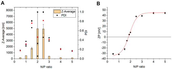 Impact of N/P ratio on particle size, polydispersity (A), and zeta potential (B) in 10 mM MES buffer pH 6.5 of T14diLys:DOPE (1:2) lipoplexes (5 ng/µL siRNA per sample), n = 3. Red dots correspond to the mean value of the three black dots, which represents the PDI.