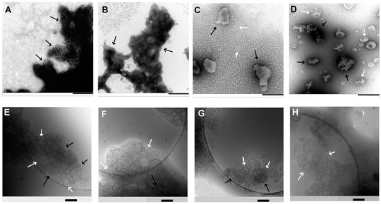 TEM images of T14diLys:DOPE (1:2) lipoplexes in 10 mM MES buffer pH 6.5 after adding uranyl acetate for negative staining at N/P 2 (A), N/P 3 (B), N/P 4 (C), and N/P 5 (D)—scale bar in (A,B) represents 500 nm—and (C,D) 250 nm Cryo-TEM images of T14diLys:DOPE (1:2) lipoplexes in 10 mM MES buffer pH 6.5 at N/P 2 (E), N/P 3 (F), N/P 4 (G), and N/P 5 (H)—scale bar in (E–H) represents 200 nm. Black arrows indicate for lipoplexes, white arrows for uncomplexed liposomes.