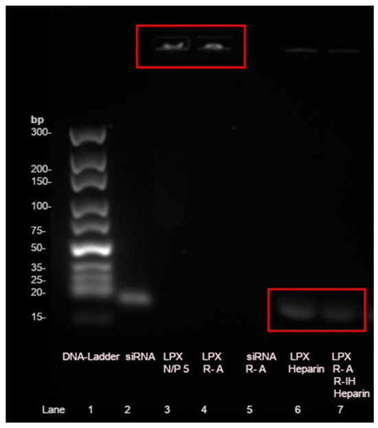 Agarose gel electrophoresis chromatogram of T14diLys:DOPE (1:2) lipoplexes (LPX) at N/P 5 after incubation with RNase A (R-A) and release of stable siRNA out of lipoplex with Heparin after RNase A and RNase Inhibitor (R-IH) treatment. The red boxes highlight the important bands.