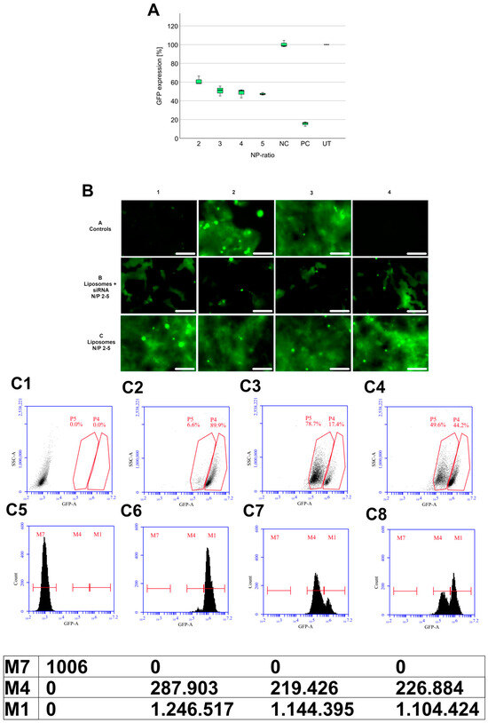 (A) Boxplot of eGFP expression level of (N/P 2–5) T14diLys:DOPE (1:2) lipoplexes at different N/P ratios after 72 h incubation (100 nM siRNA); (NC) negative control = scrambled siRNA + Lipofectamine2000 and (PC) positive control = eGFP siRNA with Lipofectamine2000 and (UT) untreated eGFP-DLD1 cells. eGFP expression was analyzed as duplicates. The experiment was repeated 3 times independently. Untreated eGFP-DLD1 cells are set to 100%. (B) Fluorescence images with Cytation 5 after 72 h from transfection of eGFP-DLD1 cells, A1 eGFP siRNA with Lipofectamine2000, and scrambled siRNA with Lipofectamine2000 (A2) with Lipofectamine2000, A3 untreated eGFP-DLD1 cells, A4 wildtype DLD1 cells. B1–4 T14 diLys:DOPE (1:2) lipoplexes N/P 2–5, C1–4 liposome amount N/P 2–5. 200 × zoom, scale bars = 100 µm. (C): Flow cytometry data as dot plots (C1–C4) and histograms (C5–C8) from (C1 + C5): wildtype DLD1 cells, (C2 + C6): eGFP-DLD1 cells, (C3 + C7): eGFP-DLD1 cells with Lipofectamine2000 + siRNA, (C4 + C6): eGFP-DLD1 cells with T14diLys:DOPE (1:2) + siRNA N/P 5. M7, 4, and 1 represent the GFP intensity in (C5–C8).