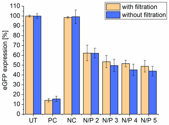 We also investigated if it is possible to perform a sterile filtration of the liposomes before the addition of siRNA. Different filter materials with 0.20 µm pore size were tried out: PVDF and RC. When filtrating the liposomes with PVDF filters, DLS measurements showed no particles anymore. The particles are probably retained by the filter material through unspecific binding. These problems did not occur with RC filters, because after filtration, particles with the same attenuator could be detected with DLS. Therefore, the RC filtrated liposomes were tested in combination with siRNA and lipoplexes at N/P 2–5 on the eGFP-DLD1 cells to see if there is a difference in knockdown efficiency to non-filtrated ones. As shown in Figure 8, there is no major difference in knockdown efficiency. This leads to the conclusion that only a neglectable amount of liposomes are retained in the RC filter material. We also tested the transfection efficiency with PVDF-filtrated liposomes, but no eGFP knockdown could be obtained. Therefore, the liposomes can be sterile-filtered without any problems before transfection with a 0.20 µm RC filter.