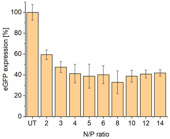 In the previous in vitro experiments, there was a slight increase in the transfection efficiency visible toward N/P 5. Therefore N/P ratios higher than 5 where selected as well to investigate if the knockdown efficiency would increase further. For this attempt, N/P ratios of 2 to 14 were applied to the eGFP-DLD-1 cells, and again the eGFP expression was measured after 72 h using flow cytometry. Figure 9 shows a plateau starting at N/P 5. At higher amounts of liposomes, the knockdown efficiency does not increase remarkably, but it is possible that the toxicity could rise, as this is the case for cationic liposomes [9,43]. The N/P ratio with the highest efficiency and the lowest amount of liposomes possible, N/P 5, was chosen for further experiments. These results match the previous results from zeta potential measurement. At N/P ratios greater than 3, we also had a zeta potential plateau (Figure 3B). Even if the number of liposomes increases, the charge of the lipoplex did not increase extremely and therefore not the transfection efficiency.