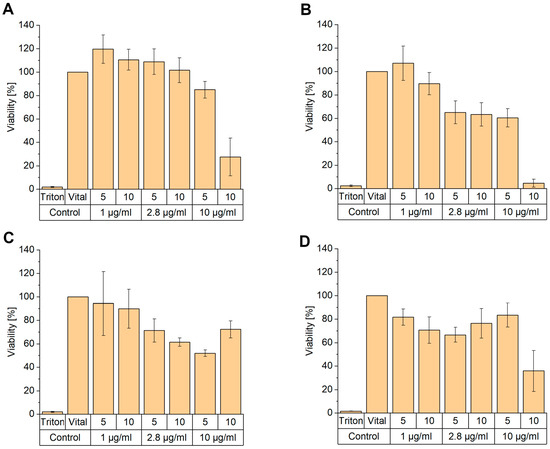 Results of cytotoxicity of T14diLys/DOPE (1:2) lipoplexes at N/P 5 and 10 with siRNA concentrations of 1, 2.8, and 10 µg/mL after 24 h and 96 h incubation in NHDF and 3T3 cells. (A) NHDF after 24 h, (B) NHDF after 96 h, (C) 3T3 after 24 h, (D) 3T3 after 96 h. The vital control contains just cells and medium representing the 100% vital cells, and the positive control includes also Triton X100, which represents the most toxic effect possible. Results are presented as mean ± SD, n = 4.