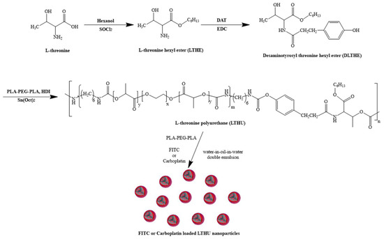 L-threonine, 1-hexanol, sodium chloride (NaCl), desaminotyrosine (DAT), anhydrous toluene, tin(II) 2-ethyl hexanoate (Sn(Oct)2), anhydrous N, N-dimethylformamide (DMF), poly(vinyl alcohol) (PVA, Mw 30,000–70,000), fluorescein isothiocyanate (FITC) and phosphate-buffered saline (PBS), dimethyl sulfoxide-d6 (DMSO-d6), and chloroform-d (CDCl3) were purchased from Sigma Aldrich (Milwaukee, WI, USA). Thionyl chloride, sodium carbonate (Na2CO3), acetone, tetrahydrofuran (THF), hydrochloric acid (HCl, 36.5%), 1-ethyl-3-(3-dimethylaminopropyl)-carbodiimide hydrochloride (EDC-HCl), di-ethyl ether, dichloromethane (DCM), hexamethylene diisocyanate (HDI), chloroform, and ethyl acetate were purchased from Daejung Chemical and Metal (Siheung, Republic of Korea). Poly(ethylene glycol) (PEG, Mw ~400), L-(−)-lactide, dibutyltin dilaurate (DBTDL), and carboplatin were purchased from Tokyo Chemical Industry (TCI) (Tokyo, Japan), and magnesium sulfate (MgSO4) was purchased from Yakuri Pure Chemicals (Kyoto, Japan). All other chemicals were of reagent grade and used without further purification.