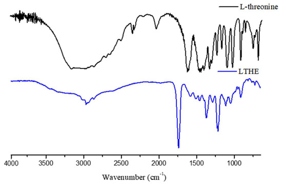 The FT-IR spectrum of LTHE, as shown in Figure 2, exhibits a characteristic C=O stretching peak at 1740 cm−1, which was originally observed at 1630 cm−1 in L-threonine. This change coincides with the disappearance of the COOH stretching signal, which was previously observed in the range of 3650 to 3000 cm−1 due to the esterification reaction between L-threonine and hexanol. The wagging vibration peak of COO− at 700 cm−1, the torsional peak of COH at 750 cm−1, and the bending peak of COO− at 767 cm−1 also disappeared in the spectrum of LTHE as a result of the esterification reaction.