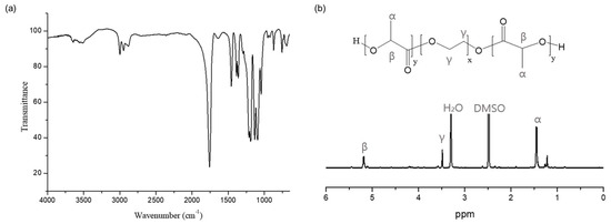 (a) FT-IR and (b) 1H-NMR spectra of PLA-PEG-PLA.