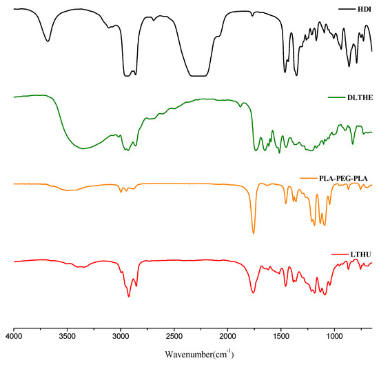 FT-IR spectra of HDI, DLTHE, PLA-PEG-PLA, and LTPU.