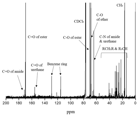In Figure 6, the 13C-NMR spectrum confirms the following characteristic peaks: amide bond C=O (171 ppm), ester bond C=O (170 ppm), urethane bond C=O (155 ppm), aromatic ring C=C (130 ppm and 115 ppm), ester bond C-O (71 ppm), ether bond C-O (69 ppm), urethane and amide bond C-N (64 ppm), and CH2/CH (40–10 ppm) and CH3 (17 ppm). Compared to the GPC analysis of the prepolymer, the molecular weight of LTPU increased continuously after chain extension and purification, while the PDI decreased. The molecular weight of LTPU was confirmed to be 28,800 g/mol with a PDI of 1.46.