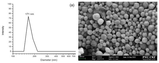 The size and morphology of blank nanoparticles (NPs) have been confirmed by DLS and FE-SEM. As shown in Figure 7a, blank NPs confirmed by DLS have an average diameter of 171 nm, making them suitable for achieving the EPR effect and serving as ideal chemotherapeutic carriers, as nanoparticles with diameters between 100 and 200 nm can passively exit the vascular system while avoiding filtration in the liver and spleen. Good agreement was also obtained with the FE-SEM image provided in Figure 7b, indicating particle sizes within 200 nm with spherical shapes and smooth surfaces.