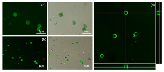 (a,b) Fluorescence microscope images and (c) confocal orthogonal view image of FITC-loaded LTPU NPs.