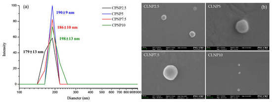 (a) DLS and (b) FE-SEM images of CLNP2.5, CLNP5, CLNP7.5, and CLNP10.