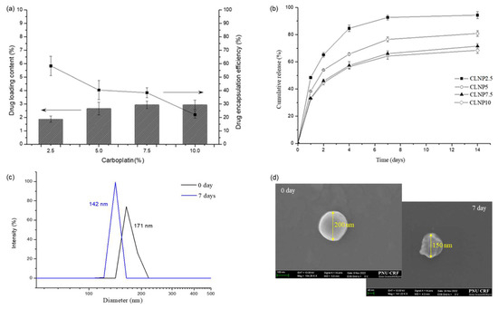 As depicted in Figure 11a, the drug loading contents, which provide indirect evidence of where the drug is located within the nanoparticle, for CLNP2.5 and CLNP5 were 1.87% and 2.65%, and the highest drug loading content reached 2.93% at carboplatin concentrations of 7.5 and 10 wt%, respectively. When considering encapsulation efficiency, CLNP2.5 exhibited the highest value at 58.3%, which implies uniform distribution, including within the shell. This value decreased as the amount of drug used increased, declining from 40.3% for CLNP5 to 38.3% for CLNP7.5 and further to 22.0% for CLNP10, respectively.