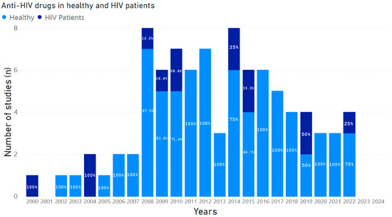 Number of studies published between 2000 and 2024, conducted in healthy volunteers and HIV+ patients that investigated potential DDI-related adverse outcomes involving drugs belonging to HAART and drugs co-administered for the treatment of comorbidities. The percentages of studies, calculated from the total number of studies published year by year, are marked within each histogram.