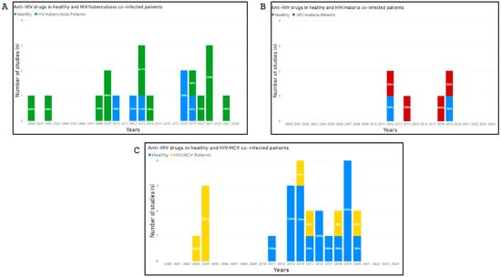 Number of studies published between 2000 and 2024, that investigated potential DDI-related adverse outcomes involving drugs belonging to HAART and drugs co-administered for the treatment of co-infections (malaria, tuberculosis and HCV). The percentages of studies, calculated from the total number of studies published year by year, are marked within each histogram. (Panel A) shows the number of studies, conducted in HIV mono-infected and HIV/Malaria co-infected patients, that investigated potential DDI-related adverse outcomes involving drugs belonging to HAART and drugs co-administered for the treatment of malaria. (Panel B) shows the number of studies, conducted in HIV/Tuberculosis co-infected patients, that investigated potential DDI-related adverse outcomes involving drugs belonging to HAART and drugs co-administered for the treatment of Tuberculosis. (Panel C) shows the number of studies, in healthy volunteers and HIV/HCV co-infected patients, that investigated potential DDI-related adverse outcomes involving drugs belonging to HAART and drugs co-administered for the treatment of HCV.