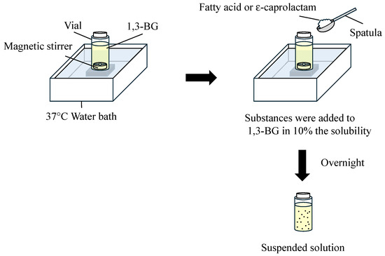 The skin penetration enhancers Azone and various IL-Azones were used as a pretreatment agent without the addition of other solvents. The enhancing effects of ε-caprolactam alone and various fatty acids alone were also evaluated as a pretreatment agent by suspending (or emulsifying) them in 1,3-BG. Figure 2 shows the preparation method of the suspended (or emulsified) solution (i.e., saturated solution) of ε-caprolactam and each fatty acid. ε-Caprolactam or each fatty acid was added to 1,3-BG in 20% the solubility, and the sample was immersed in a water bath at 37 °C overnight to prepare suspended (or emulsified) solutions. We confirmed that ε-caprolactam and some fatty acids (C12 and C14) were suspended in 1,3-BG, whereas other fatty acids (C8, C10, and C18:1) were found to separate into two layers when mixed in 1,3-BG at 37 °C. We applied these 1,3-BG solutions on the skin as a pretreatment agent.