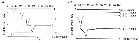 Endothermic peaks at 13.9 °C and 25.1 °C for C12 IL-Azone and C14 IL-Azone, respectively (Figure 3b), must be attributed to the melting point for the ILs. The melting points for C8, C10, and C18:1 IL-Azone are probably below 0 °C.