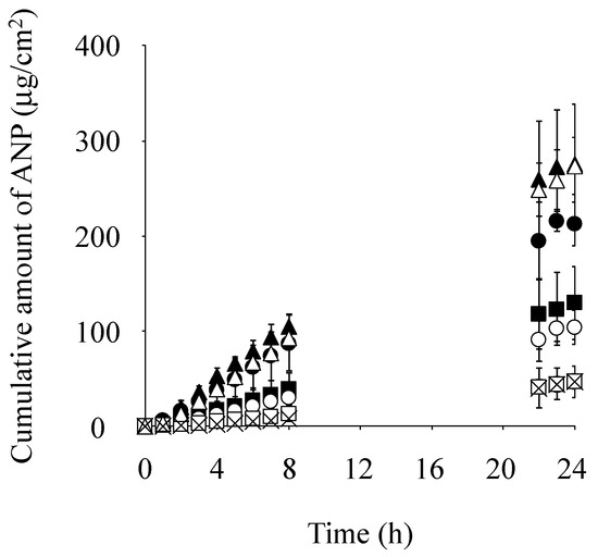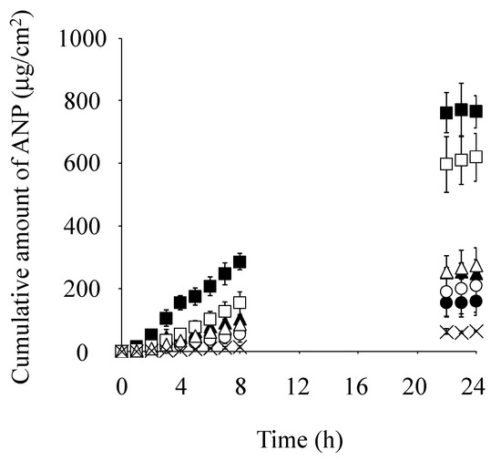 Pretreatment effects of Azone and each IL-Azone on the cumulative amount of ANP permeating through the skin over 24 h. Symbols: control (saline; ×), IL-Azone (C8; ⬤, C10; ▲, C12; ■, C14; ◯, and C18:1; △), and Azone (☐). Each data point represents the mean ± S.D. (n = 3–4).
