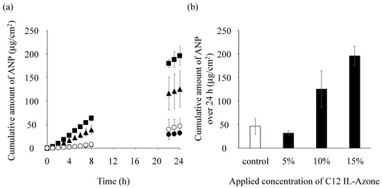 Pretreatment effects of C12 IL-Azone in 1,3-BG at a C12 concentration of 5, 10, or 15% on the skin permeation of ANP. (a) Time course of the skin permeation of ANP. Symbols: control (1,3-BG alone; ◯), 5% IL-Azone of C12 (⬤), 10% IL-Azone of C12 (▲), 15% IL-Azone of C12 (■). (b) Relationship between the cumulative amount of ANP that permeated through skin over 24 h after the application of ANP with C12 IL-Azone. Each data point and column represent the mean ± S.D. (n = 3).