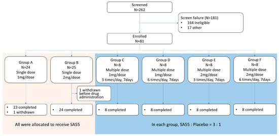 | Group A 1 mg | Group B 2 mg | Total | Group C 1 mg/dose 3 Doses/Day | Group D 1 mg/dose 6 Doses/Day | Group E 2 mg/dose 3 Doses/Day | Group F 2 mg/dose 6 Doses/Day | Placebo | Total | |