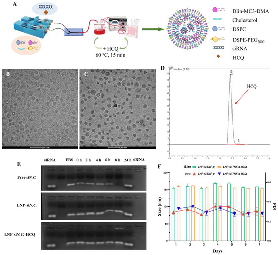 Characterization of LNP-siTNF-α and LNP-siTNF-α-HCQ. (A) Preparation process of LNP-siTNF-α-HCQ. Morphology of LNP-siTNF-α (B) and LNP-siTNF-α-HCQ (C) characterized by cryo-electron microscopy. (D) The high-performance liquid chromatogram of HCQ. (E) The serum stability of free siN.C., LNP-siN.C., and LNP-siN.C.-HCQ. (F) The particle size and PDI stability of LNP-siTNF-α and LNP-siTNF-α-HCQ.