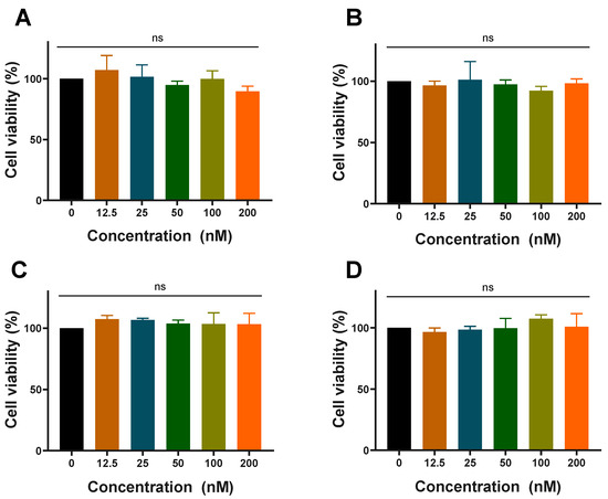 Cytotoxicity in RAW 264.7 cells of LNP-siN.C. (A), LNP-siTNF-α (B), LNP-siN.C.-HCQ (C), and LNP-siTNF-α-HCQ (D) prepared with different concentrations of siRNA; ns: no significance.
