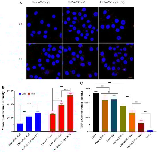 Subsequently, LNPs were prepared using Cy5-labeled siN.C. (siN.C.-Cy5), and RAW 264.7 cells were selected to assess their cellular uptake. Free siN.C.-Cy5, LNP-siN.C.-Cy5, and LNP-siN.C.-Cy5-HCQ were incubated with RAW 264.7 cells for 2 h and 5 h, respectively, and analyzed by CLSM and flow cytometry. The results of CLSM are shown in Figure 3A, the free siN.C.-Cy5 group had almost no red fluorescence (Cy5) after 2 h incubation with RAW 264.7 cells, and only weak fluorescence around individual cells could be seen at 5 h. The red fluorescence of LNP-siN.C.-Cy5 and LNP-siN.C.-Cy5-HCQ groups was observed in the cytoplasm and near the nucleus after 2h. The fluorescence intensity was stronger after 5 h, indicating that siRNA could be taken up by the RAW 264.7 cells at 2 h. The amount of LNPs taken increased with the extension of incubation time with the cells. Therefore, when LNPs deliver siTNF-α, which can silence TNF-α, siTNF-α can exert its gene-silencing effect in the cytoplasm after its endosomal escape. Flow cytometry was further performed for quantitative characterization (Figure 3B). RAW 264.7 cells were incubated with free siN.C.-Cy5, LNP-siN.C.-Cy5, and LNP-siN.C.-Cy5-HCQ groups for 2 h. The mean fluorescence intensity (MFI) of the LNP-siN.C.-Cy5-HCQ group was significantly higher than that of free siN.C.-Cy5 (p < 0.001) and LNP-siN.C.-Cy5 (p < 0.01). Similarly, after incubation for 5 h, the MFI value of the LNP-siN.C.-Cy5-HCQ group was significantly higher than that of free siN.C.-Cy5 and LNP-siN.C.-Cy5, and higher than the MFI of 2 h. These results indicate that LNP-siN.C.-Cy5-HCQ has a higher cellular uptake capacity. When LNP-siN.C.-Cy5-HCQ is co-cultured with RAW 264.7 cells, LNPs are taken up by the cells and enter into the endosomes, and siRNAs need to escape into the cytoplasm to exert their silencing effect. One of the mechanisms of HCQ is the inhibition of lysosomal activity and autophagy [13,38], which enables it to play an important role in facilitating the endosomal escape of siRNA and its cytoplasmic delivery. Therefore, LNPs that co-encapsulates HCQ and siRNA have a more substantial gene-silencing effect.