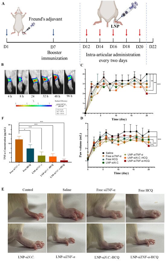 Therapeutic efficacy of LNP-siTNF-α-HCQ on adjuvant-induced rheumatoid arthritis rat model. (A) Timeline of in vivo study. (B) Biodistribution of LNP-siTNF-α-HCQ in rheumatoid arthritis rat articular cavity. Arthritis score (C), paw volume (D), and TNF-α content (F) in plasma of AIA rats were assessed in different groups. (E) The picture of the rat’s hind paw in different groups before sacrifice. * p < 0.05, ** p < 0.01, *** p < 0.001.