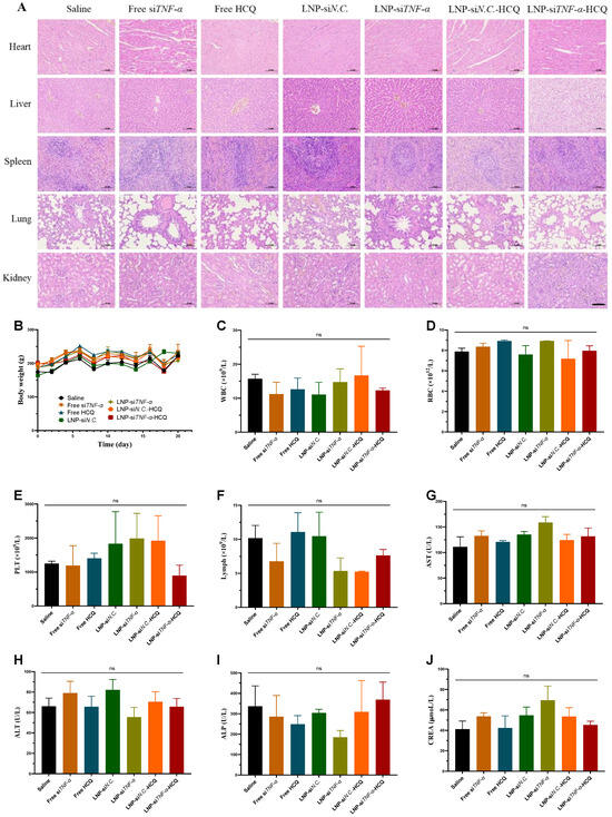 Major organs, including the heart, liver, lung, spleen, and kidneys, were harvested and subjected to H&E staining to determine tissue histopathology. As illustrated in the H&E images (Figure 5A), the rats treated with LNP-siTNF-α-HCQ exhibited no noticeable pathological abnormalities or inflammatory lesions in the major organs. The body weight of the rats in each group remained stable without a significant decrease (Figure 5B). Furthermore, whole blood was extracted from the rats at the end of the treatment period and subjected to routine blood tests. As illustrated in Figure 5C–F, the WBC, RBC, PLT, and Lymph numbers remained within the respective normal range. Moreover, serum biochemistry analyses were conducted to assess liver and kidney function parameters. No significant differences were observed among the groups (Figure 5H–J), indicating the absence of acute liver or kidney injury. The results encouraged us to conclude that LNP-siTNF-α-HCQ possesses good in vivo biocompatibility.
