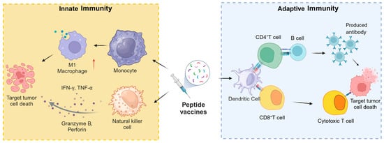 Peptide vaccines engage both innate and adaptive immune responses to form a complex network that identifies and eliminates tumor cells, as depicted in Figure 2.