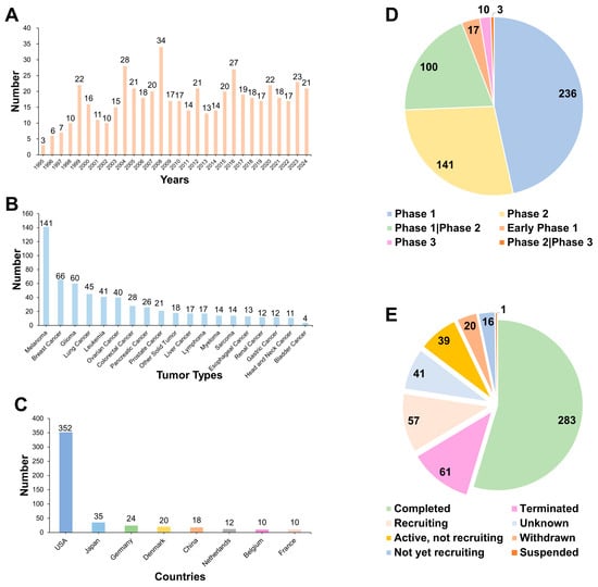 Overview of clinical trials of peptide-based vaccines. (A–E) Numbers of registered clinical trials grouped by year, tumor type, country, study phase, and status, respectively.