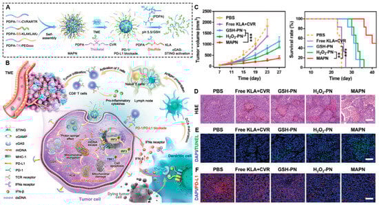 MAPN—mediated activation of the cGAS-STING Ppthway and PD-1/PD-L1 blockade for cancer immunotherapy. (A,B) Schematic illustration of multi-stimulus activatable peptide nanodrug (MAPN) activating the cGAS-STING pathway by promoting mtDNA leakage and blocking the PD-1/PD-L1 pathway to initiate robust and durable anti-tumor immune responses for cancer immunotherapy. (C–F) MAPN treatment could significantly inhibit tumor growth, promote tumor necrosis, and prolong the survival of B16F10 tumor-bearing mice. Adapted with permission from [], copyright 2024 Advanced Science, published by Wiley-VCH GmbH. (** p < 0.01, *** p < 0.001).