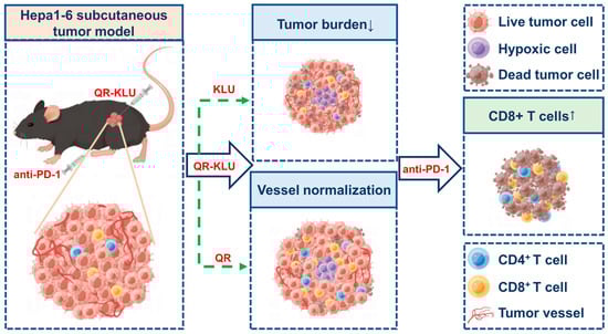 A VEGFR-targeting peptide VEGF125-136 (QR) was conjugated with a lytic peptide (KLU) to form a peptide–drug conjugate QR-KLU, QR-KLU and anti-PD-1 antibody demonstrating a strong synergistic effect in promoting the activation of intratumoral CD8+T cells, reducing the expression of immune-inhibitory factors, and increasing the expression of immune-stimulatory factors. The green arrows denote the peptide QR-KLU, which is comprised of the sequences QR and KLU. The KLU component induces cytotoxicity in tumor cells through membrane disruption, thereby decreasing tumor burden, while the QR component exhibits anti-angiogenic properties by targeting the vascular endothelial growth factor receptor (VEGFR), facilitating the normalization of tumor vessels. The blue-bordered arrows with white fill illustrate that, under the influence of QR-KLU in conjunction with the anti-PD-1 antibody, the tumor undergoes necrosis, vascular normalization is achieved, and the immune system is activated. Adapted with permission from [], copyright 2024 Springer Nature.