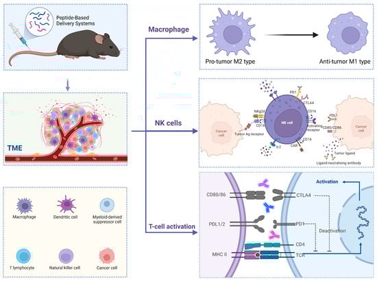 In addition to their direct impact on the immune system, peptides can also act as vehicles to deliver immunologically active drugs to the tumor site via cell penetrating peptides, tumor homing peptides, or self-assembling peptide materials. Figure 6 summarizes the tumor immune response induced by peptide-based delivery systems.