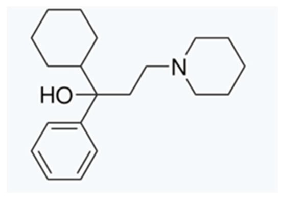 - National Library og Medicine, PubChem. Trihexyphenidyl Hydrochloride. Available online: https://pubchem.ncbi.nlm.nih.gov/compound/66007 (accessed on 4 January 2023).