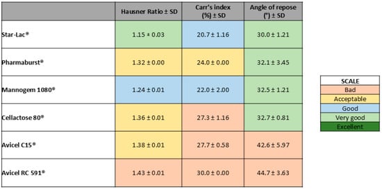 For each physical mixture (diluent + API), three individual measurements were made to determine the Hausner ratio, Carr’s index, and angle of repose. A color was assigned to the average of each parameter and classified as non-acceptable, acceptable, good, very good, or excellent. The results of each parameter according to the USP 43 numerical range [] scale are color-coded and presented in Figure 2.