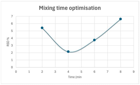 It is known that the effect of powder mixing time can directly impact on the homogeneity of the blend, as well as the disintegration and dissolution time. A poor homogeneity of the mixture refers to a poor distribution of the API that can ultimately affect the patient’s treatment. Therefore, the uniformity of the mixture must be ensured, and for this reason, a mixing time test was carried out applying the quartering technique. In order to optimize the mixing time, the powder mixture was divided into four equal fractions at different times, and the RSD of the API concentration among these was evaluated. Figure 3 depicts that at low mixing times, the calculated RSD is high. As mixing continues, the RSD value reaches a minimum. From this point on, the increase in the calculated RSD values is indicative of powder heterogeneity. The selected mixing time corresponds to the lowest point of the graph obtained from RSD vs. mixing time.