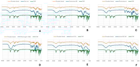 ATR-FTIR analysis of THP and its respective co-process excipient and powder blend. (A) Star Lac; (B) Cellactose 80; (C) Pharmaburst; (D) Mannogem 1080; (E) Avicel C15; (F) Avicel RC 591.