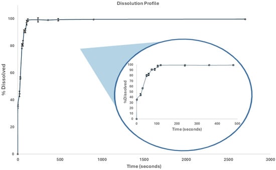 The dissolution profile of the THP ODMTs provides information on how the formulation will perform in vivo. As shown in Figure 7 (percentage dissolution vs. time plot), it was observed that 2 min after the start of the test, 100% of the THP was dissolved (Q = 70% according to USP 43 []).