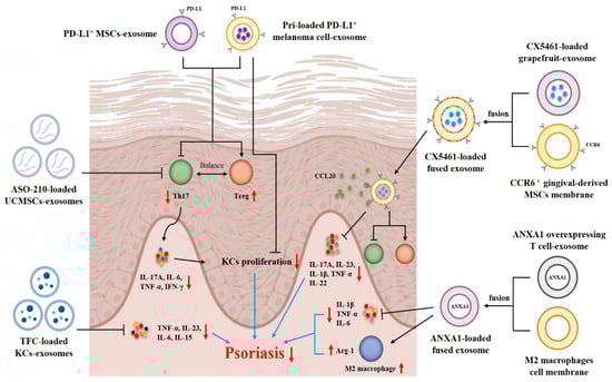 Exosomes serve as drug delivery systems for psoriasis treatment. Umbilical cord mesenchymal stem cell (UCMSC)-derived exosomes improve the delivery efficiency and stability of antisense oligonucleotides of miR-210 (ASO-210). ASO-210-loaded UCMSC-exosomes reduce psoriasis symptoms by suppressing Th17 cells and reducing enrichment of IL-17A, IFN-γ, IL-6 and TNF-α in lesional skin. Compared to free tofacitinib (TFC), TFC-loaded keratinocyte (KCs)-derived exosomes show higher suppressive effects on the expression of TNF-α, IL-23, IL-6 and IL-15 and better therapeutic effects on IMQ-induced psoriasis in mice. Compared to PD-L1- exosomes, PD-L1+ MSC-derived exosomes enhance their therapeutic effects on psoriasis by restoring Th17/Treg balance and inhibiting the expression of IL-17A, IL-6 and TNF-α. PD-L1+ melanoma cell-derived exosomes can increase pristimerin (Pri) uptake by CD4+ T cells, resulting in restoration of the Th17/Treg balance and decrease in abnormal proliferation of KCs. Annexin A1 (ANXA1)-loaded and fused exosomes retain the anti-inflammatory properties of M2 macrophages and ANXA1 protein. They upregulate the expression of M2 macrophage biomarker, arginase-1 (Arg-1), and reduce the levels of IL-1β, IL-6 and TNF-α in lesional skin. Finally, CX5461-loaded and fused exosomes target CCL20-rich inflamed skin through the chemotaxis function of CCR6 expressed on their surface and alleviate IMQ-induced psoriasis by reshaping the Th17/Treg balance and reducing the secretion of IL-17A, IL-23, IL-22, IL-1β and TNF-α. (Upward, vertical and red arrows denote increasing, while downward, vertical and red arrows indicate decreasing).