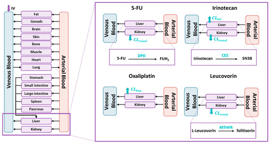 Most of the dose of 5-FU (90%) undergoes saturable catabolism by dihydropyrimidine dehydrogenase (DPD), leading to the formation of dihydrofluorouracil (FUH2), while the rest is excreted in the urine [60]. Oxaliplatin undergoes a non-enzymatic conversion to active derivatives and its elimination only involves the renal pathway [61]. Leucovorin is administered as a racemic mixture and only one of the isomers, L-leucovorin, shows pharmacological activity. Leucovorin is metabolized by 5,10-methylenetetrahydrofolate reductase, obtaining 5,10-methylenetetrahydrofolate (folitixorin). Additionally, leucovorin is primarily eliminated through renal excretion. [6]. Figure 2 shows the main PBPK model structure with the metabolic process schemes for each parent drug.